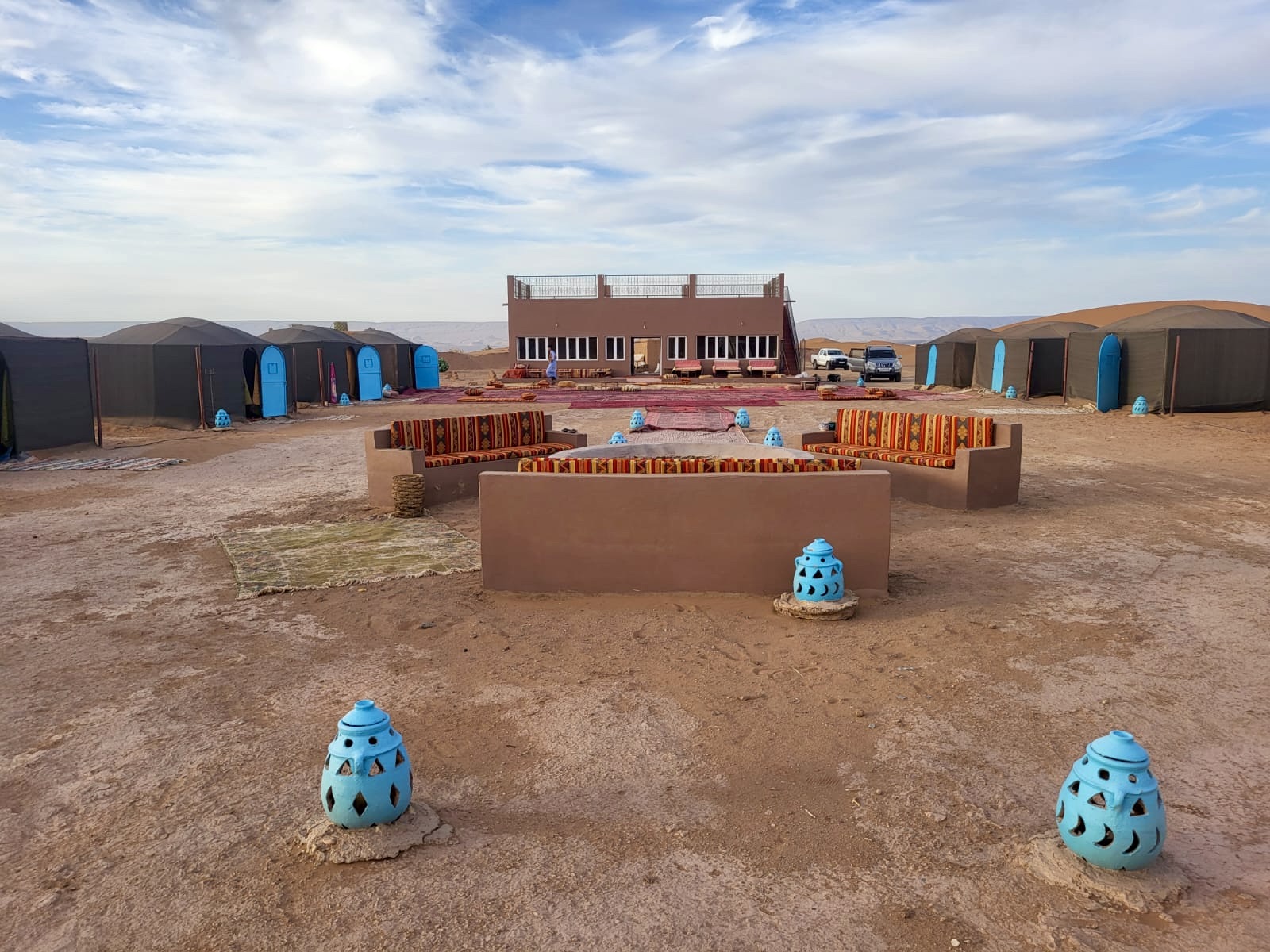 Nach dem Frühstück fahren wir durch das grüne Draa-Tal, 100 km Palmen säumen die Straße nach Zagora als eines der größten Palmengebiete. Wir fahren durch Tamegroute, berühmt für seine handwerkliche Keramikproduktion, und erreichen M'Hamid, wir halten für Mittagessen. Von M'Hamid aus, und nachdem wir uns von der Zivilisation verabschiedet haben, setzen wir unsere Reise in die Wüste fort und begeben uns auf eine unvergessliche Fahrt mit dem Jeep durch die Sahara. Nachdem wir 60 km Offroad zurückgelegt haben, erreichen wir die Dünen von Erg Chegaga - eine erstaunliche Dünengruppe von goldenem Sand, die sich über 40 km erstrecken und eine Höhe von 300 Metern erreichen. Nach eine Tasse Pfefferminztee und einige Nüsse starten Sie mit Kamelen zu einer unvergesslichen Tour zum Sonnenuntergang. Ein traditionelles Nomadenessen mit Musik ums Lagerfeuer und Übernachtung in einem Nomadenzelt. F/-/A