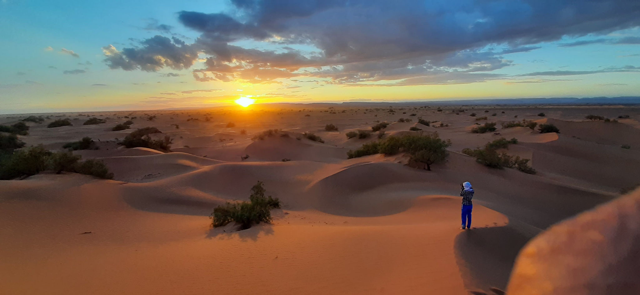 In the morning and after breakfast in the camp, before we continue by jeep to the village of Mhamid. Then, we head towards Erg Chegaga passing various desert landscape full of sand dunes, trees and stony desert. After covering 50 km of track, we reach the sacred oasis, where we have lunch before continuing towards the dunes of Erg Chegaga – the amazing group of golden desert dunes stretching for 40 km and reaching a height of 300 meters. A cup of mint tea and some nuts are offered before you ride camels for an unforgettable tour to enjoy the sunset. A traditional nomad dinner with music around fire and overnight accommodation in a nomad tent or outside surrounded by the dunes of the Sahara. B/L/D